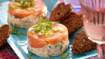 Damp laksen i letsaltet vand, del den i flager og lad den afkøle. Beklæd 4 portionsskåle med film og læg en skive røget laks i bunden. Mos halvdelen af den dampede laks med flødeosten og rør hakket dild og fintsnittet forårsløg i. Hak resten af den røgede laks fint og og vend den forsigtigt i flødeosteblandingen sammen med resten af den dampede laks. Fyld portionsskålene op med lakseblandingen og stil dem på køl i mindst 30 min. Vend laksepatéerne ud og anret dem med ristet rugbrød, hakkede forårsløg og dild.