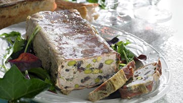 Smør en 1 liters brødform. For formen med bacon eller pancetta. Rør resten af ingredienserne til en fars, der krydres med salt og peber. Fyld i brød form og læg pres på. Luk med bacon og så med bagepapir. Kom i vandbad til halvt op ad siderne og bag i ovnen i 112 time ved 180°. Lad den afkøle og server med agurkesalat (klik her for opskrift).
