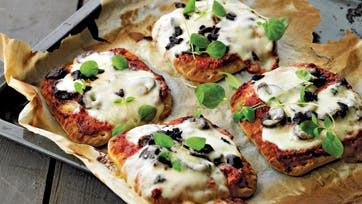 Læg brødene på en plade med bagepapir og rør tomatpuréen med vand, oregano og hvidløgspeber. Udsten og hak olivenerne og skær mozzarellaen i tynde skiver. Smør tomatpuréen på brødene, drys med oliven og læg mozzarellaskiverne over. Bag pizzaerne ved 220° i 8 min. og server.