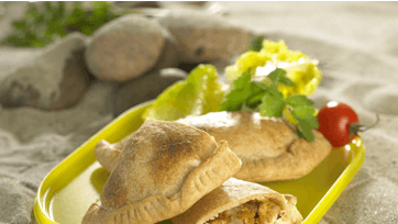 Pil og hak løgene, skær pæren i små stykker. Mos kartoflerne med en gaffel. Skær kyllingekødet i tynde strimler. Svits løg og pære 2-3 min. i olien og bland det med kartofler og kylling. Smag til med tacokrydderi og køl det af. Lav dejen efter pakkens anvisning. Læg den på et melet bord og del den i 5 stykker. Rul dem ud til ca. 15 cm i diam. Læg fyldet på indtil 2 cm fra kanten. Fold dejen over og knib kanterne godt sammen. Læg dem på en plade med bagepapir. Pensl med koldt vand og bag på midterrillen ca. 15-18 min. ved 225°, til de er gyldenbrune.
