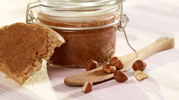 Rist hasselnødderne i ovnen ved 200° i 7 min. Kom nøddekernerne i et rent og tørt viskestykke og gnid skallerne af kernerne. Mal kernerne til mel i en blender eller i en rengjort kaffemølle. Smelt nougat sammen med sirup og smør ved svag varme under omrøring. Bland de malede nødder med vanilje og muskatnød og rør det i nougatblandingen. Kom smørepålægget på glas og opbevar det på køl.