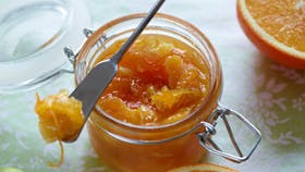 Skær abrikoserne i smalle strimler, hæld vand over og lad dem bløde ud i et par timer. Skær skrællen af appelsiner og lime med et juliennejern, pil den hvide skal af appelsinerne og skær appelsinkødet i tern. Pres saften af limefrugten og kom den i en gryde sammen med appelsin- og limeskal, abrikoser og appelsinkød og lad det koge op. Tilsæt sukkeret og lad marmeladen koge i 10 min. Hæld marmeladen på rengjorte, skoldede glas og luk til.