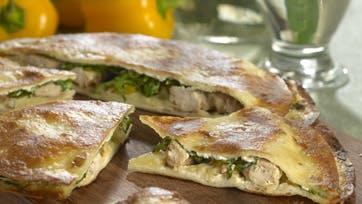 Bland kyllingekødet i en skål med fiskesauce, citronsaft, sukker og koriander. Mariner 15 min. og dup kyllingen tør. Steg kyllingestrimlerne på en godt varm pande i lidt olie 4-5 min., til de er gennemstegte. Flæk peberfrugten, fjern kernerne og skær den i tynde strimler. Smør et tyndt lag friskost på brødene og riv osten over. Fordel peberfrugt, kylling og rucola på 2 af brødene. Dryp chilisauce over og læg de sidste 2 brød over. Klem det lidt sammen og rist dem på begge sider på pande i lidt olie, til de er gyldne, og osten begynder at smelte. Skæres i trekanter og spises lune.