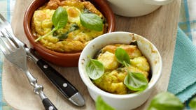 Skær overfladen af osten og skær den i tern. Tag bladene af basilikumstilkene. Smør 4 portionsskåle med olivenolie og kom æggemassen i skålene - de skal fyldes halvt op. Fordel courgetteskiver, bacon, ost og basilikum i formene og stil dem i ovnen ved 180° i 20 min. Servér dem som forret eller frokostret.