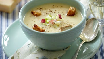 Riv osten og læg den i hvidvinen i 1 time. Pil og hak skalotteløget, sautér i smør og kom grønsagssuppe ved. Rør majsstivelse ud i lidt koldt vand og kom det i osten sammen med citronsaft. Kom ostemassen med vinen op i suppen og varm langsomt op, til det smelter. Varm videre, til det jævner, og servér varm med tern af æbler, blegselleri og brødcroutoner.