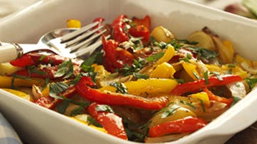 Forsteg kartoflerne i ovnen ved 200° i 15 min. Steg imens løg og peberfrugter i olie på pande. Vend det hele sammen, og tilsæt krydderurter, salt og peber. Stil det hele i ovnen ved 190° i 45 min.