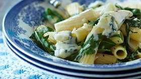Kog pastaen efter pakkens anvisning. Skyl og tør rucolaen. Vend den kogte, afdryppede pasta sammen med rucolaen og dryp med lidt olivenolie. Anret pastaen i en stor skål, hæld ostesaucen over og vend godt rundt.