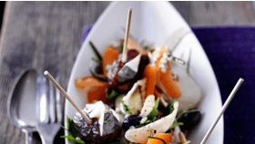 Fyldte dadler: Skær et snit i siden af dadlerne og pil stenen ud. Læg en lille skive Sort Castello i hver daddel og stik et træspyd i.