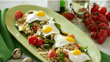Fremgangsmåde til perlebygsalat med vagtelspejlæg