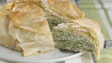Skyl spinaten og damp den i den væde, der hænger ved. Lad den dryppe meget grundigt af i et dørslag. Hak den groft. Pisk ricotta ensartet i en skål, tilsæt æg og æggehvider, muskat, persille, salt og peber. Rør spinaten i. Smør en springform på ca. 20 cm i diameter og læg lag af fillodej i som bund. Læg spinatblandingen i dejen og fold fillopladerne ind over penslet med olie. Sæt den i ovenen ved 180° i 45-50 min. Lad den hvile og skær den i lagkagestykker, der spises med salat.