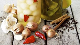 Pil løgene og kom eddike, vand, sukker og krydderier i en gryde. Tilsæt løgene og lad det koge langsomt op. Lad løgene småsimre i lagen i 7 min. Hæld løg og lage på et skoldet glas og luk til. Løgene er klar til brug med det samme.