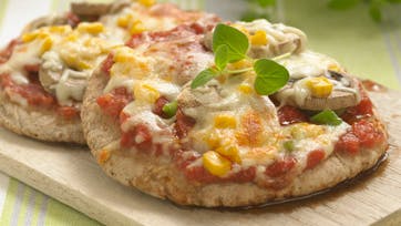 Blend tomaterne og rør dem med tomatpure, oregano og salt. Læg pitabrødene ud på en bageplade med bagepapir og fordel tomatsovsen over brødene. Skær champignoner og peberfrugt i tern og kom dem på brødene sammen med majs og pepperoni. Fordel osten over pizzaerne og bag dem ved 200° i 15 min.