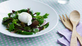 Skær eller træk forsigtigt eventuelle flossede kanter af de pocherede æg, og lad æggene dryppe af et øjeblik på et rent viskestykke, inden de lægges oven på salaten. Server med brød til.
