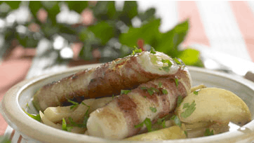 Fjern det grønne på porrerne (kan bruges i suppe), og skyl dem godt. Kog dem 8-9 min. i letsaltet vand. Køl porrerne af, og vikl bacon om. Pak dem stramt hver for sig i film, og pak alufolie udenom. Kog pakkerne 3 min. i vand. Tag dem op og køl af, gerne til næste dag. Varm en smule olie på en stegepande, og fjern indpakningen. Steg porrerne, til baconen er sprød.