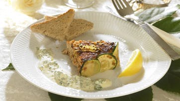 Skær laks, skalotteløg og fennikel i små tern. Svits løg og fennikel mørt i olie ved jævn varme 8-10 min. og afkøl det. Skær courgetten i tynde skiver og steg dem på begge sider et øjeblik. Rør laksen med æggeblommer, dijonsennep, cremefraiche og afkølet løgblanding. Krydr med salt og peber. Kom lakseblandingen i en form uden bund 2-3 cm høj og 15-20 cm i diameter, som lægges på f.eks. en tallerken. Lad den fra tallerknen glide over på en pande og steg den i smør/olie 7-10 min. på hver side afhængig af tykkelsen.