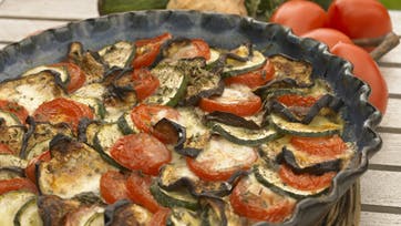 Pil løgene og skær dem i tynde skiver. Hak hvidløgene. Steg det ved mellemvarme i olivenolie, uden at det tager farve, 10-12 min., til de er møre. Skær auberginerne i ½ cm tykke skiver og læg dem tæt på plade med bagepapir. Drys med salt og sæt dem i ovnen ved 200° 5-10 min., til de er bløde. Skær courgetter og tomater i ½ cm tykke skiver. Skær mozzarellaen midt over og skær den i skiver. Læg løgene i bunden af et ildfast fad og krydr med timian. Læg auberginer, tomater, courgetter og mozzarella taglagt og tæt oven på løgene. Krydr med salt og peber og dryp olivenolie over. Sæt fadet i ovnen ved 200° ca. 40 min.
