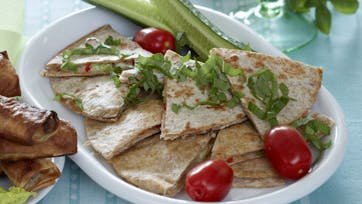 Pil og hak forårsløgene fint. Smør hvidløgsost på halvdelen af tortillaerne. Drys løg, chili og ost over og læg de andre brød på. Tryk dem lidt sammen, så de ikke åbner sig under stegningen. Steg brødene på en tør stegepande, til de er gyldenbrune. Skær dem i store trekanter og spis dem lune med basilikum, tomater og flækkede skoleagurker.