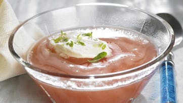 Server suppen varm med koldt, letpisket flødeskum og finthakket mynteblade.