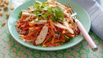 Skær radiser, gulerødder og forårsløg i tændstikstynde stave. Pisk olie, eddike, chilisauce og salt sammen. Hæld dressingen over grønsagerne, tilsæt kyllingen og drys med peanuts og koriander.