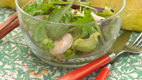Fjern kernerne i chilien og hak den fint. Hak rabarberne meget fint. Snit forårsløg og basilikum. Del avocadoerne, grav kødet ud med en teske og læg det i en skål. Tilsæt rejer, chili, rabarber og forårsløg. Bland dressingen og vend den i salaten. Lad den trække 15-20 min. i køleskab. Anret salaten portionsvis på salatblade og spis flute eller ristet grovbrød til.