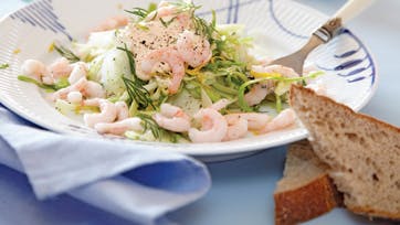 Snit spidskålen meget fint. Høvl fennikel med en kartoffelskræller, vend begge dele med groft salt og lad det trække i 20 min., så kålen mørnes. Skyl det godt og dup det tørt i et rent klæde. Vend med hakket dild, citronsaft og skal, peber, hvidløg og olivenolie. Anret som bund på to tallerkner. Rør cremefraiche med paprika, salt og peber, kom en skefuld på hver tallerken. Top med rejer og lidt spæde salatblade, server med citronbåde og groft brød.