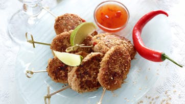Hak rejerne og lad krabbekødet dryppe af. Hak chilierne og skær limebladene i strimler. Bland rejer, krabbekød, chili, limeblade, koriander, oystersauce og tahin til en ensartet fars. Form farsen om 20, små spid og vend dem i sesamfrøene. Steg rejespiddene ved middelhøj varme i 3 min. på hver side. Server dem kolde eller lune med sød chilisovs.