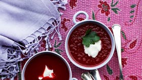 Skræl rødbeder, kartofler og knoldselleri og skær dem i tern. Hak skalotteløg og hvidløg fint. Steg løg og urter let i olien, uden at det tager farve. Kom rødbeder, kartofler og selleri i og lad det svitse med et par min. under konstant omrøring. Tilsæt flåede tomater, bouillon, balsamicoeddike, honning og røget paprika og lad suppen koge ved svag varme under låg i 30 min. Blend suppen, til den er helt jævn og ensartet, gerne med en stavblender direkte i gryden, smag den til med salt og peber og server med godt brød.