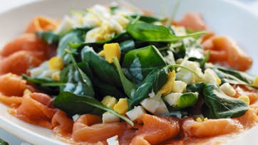 Pisk fløden og rør alle ingredienserne til peberrodsdressingen sammen og lad det stå i 5 min. Anret laksen på et stort fad. Skyl og tør spinaten og læg den midt på fadet. Fordel dressingen over spinaten kort før servering og drys med hakkede æg.