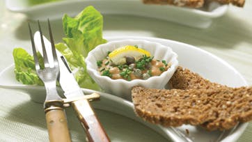Træk hinderne af rognen og rør den ensartet med en gaffel. Rør rognen med æggeblommer, olie, kapers og finthakket løg. Smag til med salt og peber. Server portionsvis eller i en skål med citronbåde og kapers.