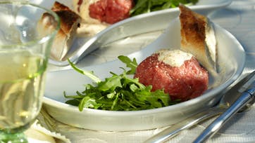 Smag mayonnaisen til med Worcestersauce, citronsaft, salt og peber og fortynd den evt. med lidt vand. Rør kødet blødt og lækkert med olivenolie, æggeblomme og salt og form 2, høje bøffer. Læg dem på rucola og øs saucen over. Servér med flutes og salat eller grønne asparges.