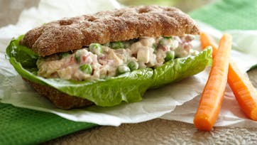 Hæld olien fra ørreden og lad den dryppe godt af. Rør fisken med mayonnaise og citronsaft. Hak peberfrugt og champignoner fint. Rør ærter, champignoner og peberfrugt i fisken og smag den til med salt og peber. Kom ørredsalaten og salatbladene på rugklapperne og servér.