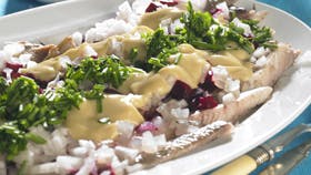 Pil sildene og læg fileterne på et fad. Drys rødbeder, agurker, kapers og løg over.