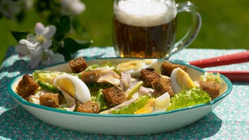 Læg salaten portionsvis på tallerkner sammen med æggene og croutoner.