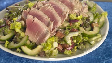 Vend rabarberne i salaten og anret den med skiver af tunen over. Drys med forårsløg og server.