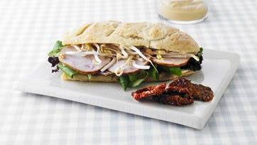 Blend æggeblommerne med salt og skær tomaterne i mindre stykker. Tilsæt eddike og tomater og blend, til blandingen er helt findelt. Blend, mens olien tilsættes lidt efter lidt, til mayonnaisen begynder at tykne. Smag til med salt og peber og halver bollerne. Smør bollerne med mayonnaisen og fordel kylling, salat og spirer på underbollerne. Læg overbollerne på og server.