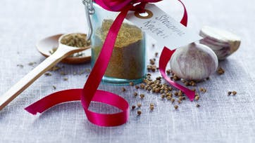 Rist spidskommen, koriander, nelliker og peberkorn på en tør pande, til duftstofferne frigives. Stød dem fint i en morter eller en krydderikværn. Bland med de øvrige krydderier og kom blandingen på glas med tætsluttende låg.