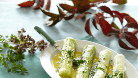 Pisk sennep, olie og vineddike sammen og smag til med honning, salt og peber. Hæld marinaden over porrerne og drys dem med hakket grønt. Spis porrerne lune eller kolde.
