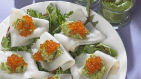 Tag skallen af avocadoerne, flæk dem og fjern kødet. Mos kødet med en gaffel sammen med citronsaft. Tilsæt æbletern og smag til med salt og citronpeber. Læg fiskeskiverne foldet på salatblade. Kom en stor klat avocado ovenpå og pynt med rogn og dild.