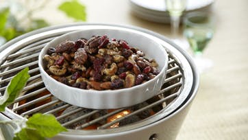 Bland nødderne med olien og kom blandingen i et ildfast fad. Sæt fadet på grillen, bland krydderierne og drys dem over nødderne. Lad nødderne riste, til de begynder at tage farve, mens der vendes godt rundt i blandingen. Tag fadet af grillen, vend tranebær og rosiner i og server nødderne som snack.