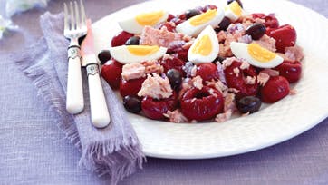 Kog æggene smilende og skær dem i kvarte. Pil og hak løget. Pisk eddike og olie sammen til dressing og vend løget i. Bræk tunen i mindre stykker. Anret peberfrugterne på et fad og fordel tunen, de smilende æg og oliven over. Hæld dressingen over og drys med persille.