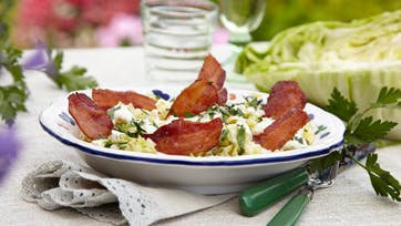 Halvér kålen, fjern det grove af stokken og snit kålen fint. Læg kål og salt i en skål og knug det med hænderne. Lad det trække køligt en times tid. Hæld kålen i en sigte, læg en underkop over og pres så meget væde af som muligt. Skær baconskiverne i lidt mindre stykker og rist dem sprøde på panden. Læg dem til afdrypning på køkkenrulle.