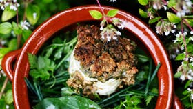 Krydderurtesalat: Bland kørvel, basilikum og klippet purløg sammen og dryp med olie og balsamico. Smag til med salt og peber. Anret den stegte gedeost oven på krydderurtesalaten og server straks.