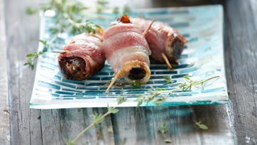Skær et snit på langs af dadlerne og fjern stenen. Fyld hullet, hvor stenen har siddet, med ost og vikl en halv skive bacon omkring, hæft evt. med en tandstik. Læg dadlerne i et ovnfast fad og steg dem i ovnen ved 250° i 15 min.