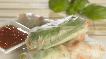 Bland rejer og chilisovs. Skyl basilikum og skær grønsagerne i tynde strimler. Læg rispapiret i varmt vand, et ark ad gangen, i et par sek. og fyld dem med grønsager, rejer og basilikum. Rul rispapiret omkring og server evt. med lidt ekstra chilisauce til at dyppe i.