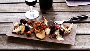Smuldr rugbrødet og rist det tørt i ovnen ved 120° i 20 min. Kog 1½ af rødbederne hele med skræl på, til de er møre, ca. 30 min. Den sidste, halve rødbede skrælles og høvles i tynde skriver, der marineres i æbleeddike med salt og peber. Rist svampene i smørret og drys med salt og peber. Skær æblet i små stykker. Pisk æggeblomme og hvidvin op og tilsæt smeltet smør lidt ad gangen. Hold sovsen lun og tilsæt krydderurterne. Fjern skindet på rødbederne og skær dem i halve på langs og evt. på tværs. Anret med rugbrødet som bund og læg rødbederne på. Hæld lidt urtesovs på tallerknen og pynt med stegte svampe og flager af rødbede. Drys med lange timiankviste og æblestykker samt lidt høvlet peberrod.