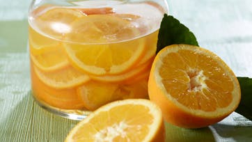 Skær appelsinerne i knap ½ cm tykke skiver. Læg dem i en gryde med 1 l vand. Kog op under låg og kog appelsinerne 2 min. Hæld dem i en sigte. Kog ½ l vand med sukkeret. Tilsæt så mange appelsinskiver, at de kan ligge i et lag. Kog dem 10 min. under låg og tag dem op med hulske. Kog resten af appelsinskiverne. Læg dem alle i et skoldet glas. Hæld lagen over og luk glasset.