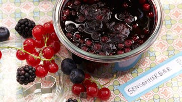 Skyl bærrene og nip dem evt. Kom alle ingredienser i en gryde og bring det langsomt i kog under låg. Sluk og tag bærrene op med en hulske. Kog saften ind i ca. 5 min., til den danner store bobler, og kom bærrene tilbage i gryden. Sluk, så snart det nærmer sig kogepunktet. Lad det køle lidt af og hæld det i et skoldet glas. De syltede bær kan holde sig 2-3 måneder på køl eller fryses og holde hele vinteren, lige klar til at tø op og bruge i en dessert som f.eks Pavlova.