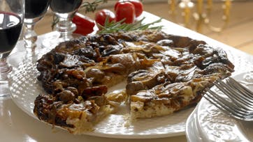 Skær hvert af de pillede løg i 6 både. Sautér dem i olien. Kom rensede, hele svampe ved sammen med sukker og lidt salt og peber. Steg i 5 min. For en tærteform med bagepapir. Kom løgblandingen i og drys med ost og nødder. Pres blandingen mod bunden.