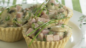 Skær champignonerne i skiver og rist dem i smørret. Rør melet i og pisk mælken i lidt ad gangen mens der røres, så opbagningen bliver jævn. Tilsæt skinketern, forårsløg, persille og muskatnød, varm det godt igennem og smag til med salt og peber. Lun tarteletterne i ovnen og kom ca. ½ dl fyld i hver.