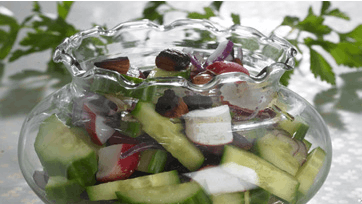 Rør dressingen sammen i en skål. Flæk agurken og skær den i ½ cm tykke skiver. Pil løget og skær det i tynde skiver. Skær peberfrugten i små tern og del radiserne i mindre stykker. Bland dressing og grønsager. Halver mandler med skal og rist dem på pande i olie. Bland sesamfrøene i og kom det over salaten.